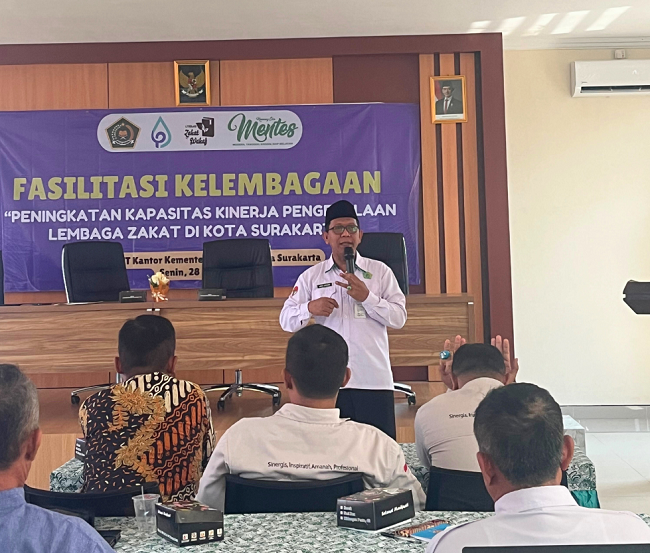 Kota Surakarta (Humas) – Fasilitasi Kelembagaan “Peningkatan Kapasitas Kinerja Pengelolaan Lembaga Zakat di Kota Surakarta” diselenggarakan oleh Kantor Kementerian Agama (Kankemenag) Kota Surakarta melalui Penyelenggara Zakat dan Wakaf (Zawa) pada Senin (28/7/2025) di Aula Pusat Layanan Haji dan Umroh Terpadu. Kegiatan fasilitasi tersebut dihadiri oleh sejumlah 35 orang yang merupakan perwakilan dari Bada Amil dan Zakat Nasional (BAZNAS) Kota Surakarta, lima Unit Pengumpul Zakat (UPZ) Masjid, dan Lembaga Amil dan Zakat (LAZ) se-Kota Surakarta. Guna memberikan dampak peningkatan kapasitas kinerja melalui kegiatan tersebut, narasumber yang dihadirkan adalah seorang expert dalam ilmu service excellent, yang menjabat sebagai Penasihat Persatuan Hotel Indonesia (PHRI) Jawa Tengah sekaligus Wakil Ketua I BAZNAS Kota Surakarta Bambang Mintosih.