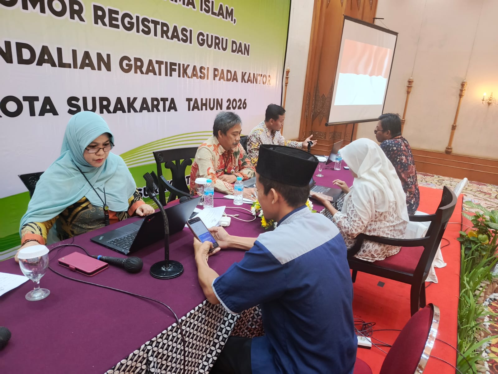 Surakarta (Humas) – Dalam rangka peningkatan Kinerja dan Kesejahteraan Guru Pendidikan Agama Islam, Kantor Kementerian Agama Kota Surakarta lewat Seksi Pendidikan Agama dan Keagamaan Islam (PAKIS) menyelenggarakan kegiatan Pembinaan Guru Pendidikan Agama Islam, Percepatan Validasi Nomor Registrasi Guru Dan Sosialisasi Program Pengendalian Gratifikasi di Hotel Sahid Jaya, Solo (29/01/2026).