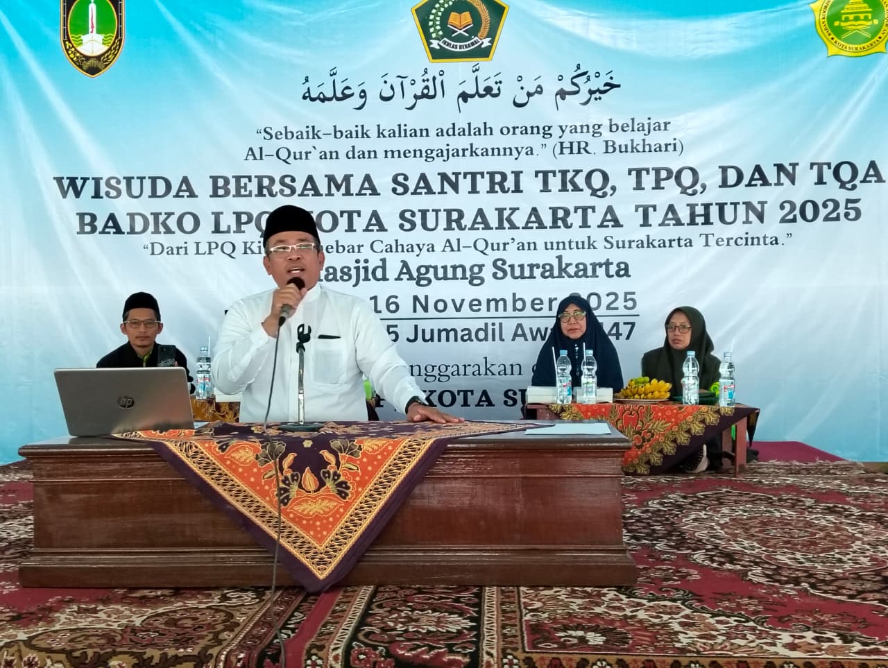 Surakarta (Humas) — Masjid Agung Surakarta kembali menjadi pusat kegiatan keagamaan terbesar tahun ini melalui Wisuda Bersama Santri TKQ, TPQ, dan TQA Badko LPQ Kota Surakarta Tahun 2025, Ahad (16/11/2025). Kegiatan berlangsung khidmat dan meriah, disertai antusiasme tinggi dari para santri, orang tua, serta ustadz–ustadzah pembimbing. Tahun ini, kegiatan mengusung tema “Dari LPQ Kita Menebar Cahaya Al-Qur’an untuk Surakarta Tercinta.”